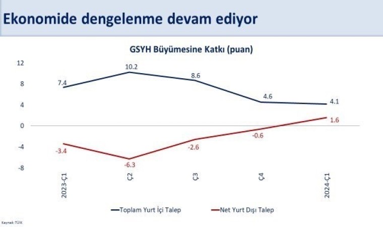 Bakan Şimşek, Türkiye ekonomisi 2024 yılı ilk çeyreğinde büyümeye devam ettiğini belirterek, “Türkiye ekonomisi 2024 yılı ilk çeyreğinde yıllık yüzde 5,7 büyüdü. Yıllıklandırılmış milli gelir 1 trilyon 158 milyar dolara ulaştı. Uyguladığımız rasyonel, öngörülebilir ve kurala dayalı politikalarla ekonomimiz daha dengeli ve sürdürülebilir bir büyümeye doğru ilerliyor. İç talebin büyümeye verdiği katkı 4,1 puan iken, net dış talebin katkısı 5 çeyrek sonra pozitife dönerek 1,6 puan oldu. Ayni dönemde yatırımlar yüzde 10,3 artarken, makine ve teçhizat yatırımları aralıksız büyümesini on sekizinci çeyreğe taşıdı. Mal ve hizmet ihracatı yüzde 4 büyüdü” açıklamasında bulundu.