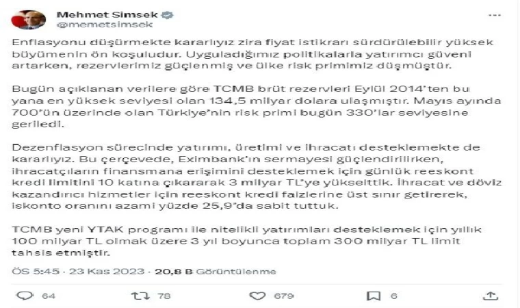 Elif ER BULUT/ANKARA, (DHA)- HAZİNE ve Maliye Bakanı Mehmet Şimşek, ”Enflasyonu düşürmekte kararlıyız zira fiyat istikrarı sürdürülebilir yüksek büyümenin ön koşuludur. Uyguladığımız politikalarla yatırımcı güveni artarken, rezervlerimiz güçlenmiş ve ülke risk primimiz düşmüştür” dedi.