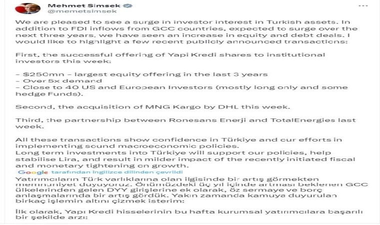 Bakan Şimşek, Twitter hesabından yaptığı açıklamada, "Yatırımcıların Türk varlıklarına olan ilgisinde bir artış görmekten memnuniyet duyuyoruz. Önümüzdeki 3 yıl içinde artması beklenen Körfez İşbirliği Ülkelerinden (GCC) gelen Doğrudan Yabancı Yatırım (DYY) girişlerine ek olarak, öz sermaye ve borç anlaşmalarında bir artış gördük. Yakın zamanda kamuya duyurulan birkaç işlemin altını çizmek isterim; İlk olarak, Yapı Kredi hisselerinin bu hafta kurumsal yatırımcılara başarılı bir şekilde arzı: - 250mn $ - son 3 yıldaki en büyük öz sermaye arzı - 5 kattan fazla talep - 40'a yakın ABD ve Avrupalı Yatırımcı (çoğunlukla uzun vadeli ve bazı hedge Fonlar). İkincisi, MNG Kargo'nun bu hafta DHL tarafından satın alınması. Üçüncüsü, geçen hafta Ronesans Enerji ile TotalEnergies arasındaki ortaklık. Tüm bu işlemler, Türkiye'ye ve sağlam makroekonomik politikalar uygulama çabalarımıza duyulan güveni göstermektedir. Türkiye'ye yapılacak uzun vadeli yatırımlar, politikalarımızı destekleyecek, Lira'da istikrara kavuşacak ve son dönemde başlatılan mali ve parasal sıkılaştırmanın büyüme üzerindeki etkisinin daha hafif olmasını sağlayacaktır" ifadelerini kullandı. (DHA)