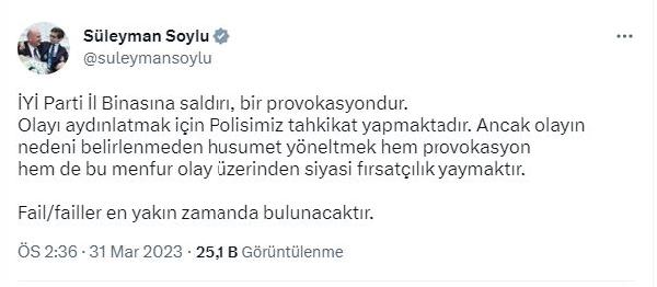 İçişleri Bakanı Süleyman Soylu, İYİ Parti İstanbul İl Başkanlığı'na yapılan saldırının bir provokasyon olduğunu belirterek, "Olayı aydınlatmak için polisimiz tahkikat yapmaktadır. Ancak olayın nedeni belirlenmeden husumet yöneltmek hem provokasyon hem de bu menfur olay üzerinden siyasi fırsatçılık yapmak anlamına gelmektedir. Fail veya failler en yakın zamanda bulunacaktır" dedi.