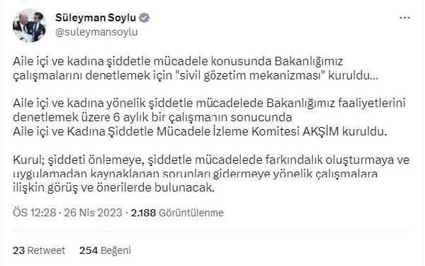 Bakan Soylu, Twitter hesabından yaptığı açıklamada, "Aile içi ve kadına yönelik şiddetle mücadelede bakanlığımız faaliyetlerini denetlemek üzere 6 aylık bir çalışmanın sonucunda 'Aile İçi ve Kadına Şiddetle Mücadele İzleme Merkezi' (AKŞİM) kuruldu. Kurul; şiddeti önlemeye, şiddetle mücadelede farkındalık oluşturmaya ve uygulamadan kaynaklanan sorunları gidermeye yönelik çalışmalara ilişkin görüş ve önerilerde bulunacak" ifadelerini kullandı. (DHA)