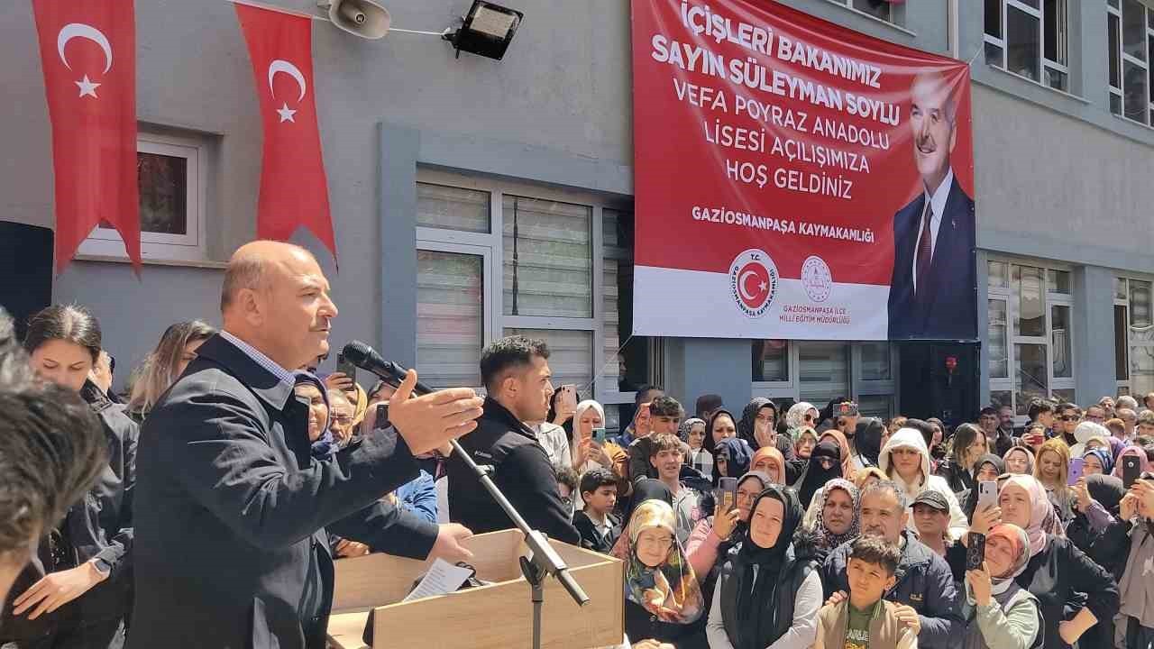 Gaziosmanpaşa’daki birçok okulun depreme yönelik yenilendiğini söyleyen Bakan Soylu, “Bu okul, daha önce de açıldı. Çok doğaldır ki insanların ömrü, gibi bir ömrü vardır. Buradaki veliler, aileler birçok kez onlarla da konuştuk. Biz, ‘okulumuzun çocuklarımızın daha güvenli bir yerde okumasını temin etmek için yenilenmesini istiyoruz’ dediler. Bugün Milli Eğitim Müdürlüğümüz, Valiliğimiz hep birlikte burada bu okul yenilendi. Buradaki birçok okul, depreme yönelik yenilendi. Gençlerimizi, çocuklarımızı hem güvenli yuvalarda hem yeni okullarda, hem teknoloji yüksekokullarda hem de öğretmenlerimizle buluşturuyoruz. Burada siz buluşurken Doğu ve Güneydoğu’daki çocuklarımızla buluşuyor. Hiç kimse merak etmesin. Türkiye’de ilk kez ülkemizin her tarafında eğitim, gelişmişlik, adalet eşit şekilde dağılmaktadır” şeklinde konuştu.