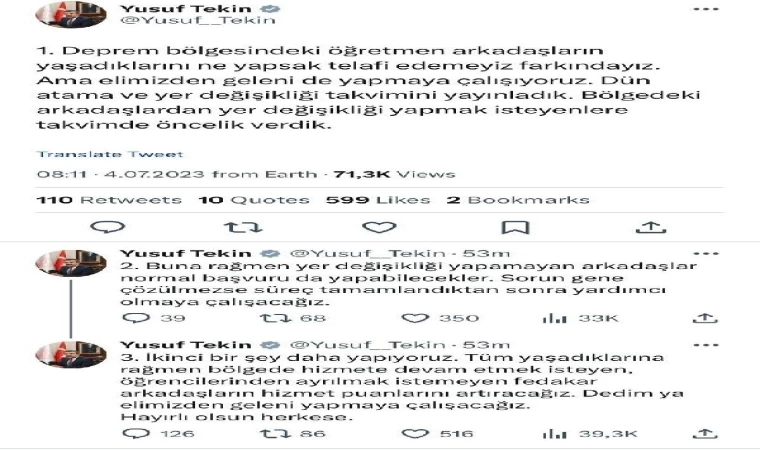 Milli Eğitim Bakanı Yusuf Tekin, deprem bölgesindeki illerde görev yapan öğretmenler için atama ve yer değişikliği takvimi hakkında dün Twitter hesabından açıklama yaptı. Bakan Tekin, "Deprem bölgesindeki öğretmen arkadaşların yaşadıklarını ne yapsak telafi edemeyiz farkındayız. Ama elimizden geleni de yapmaya çalışıyoruz. Dün atama ve yer değişikliği takvimini yayınladık. Bölgedeki arkadaşlardan yer değişikliği yapmak isteyenlere takvimde öncelik verdik. Buna rağmen yer değişikliği yapamayan arkadaşlar normal başvuru da yapabilecekler. Sorun yine çözülmezse süreç tamamlandıktan sonra yardımcı olmaya çalışacağız" dedi.
