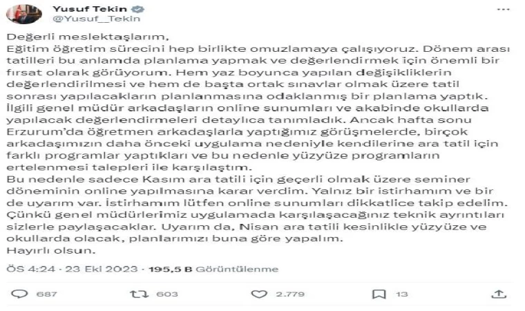 Bakan Tekin, sosyal medya hesabından 'Değerli meslektaşlarım' başlığıyla açıklama yaptı. Tekin, eğitim öğretim sürecini hep birlikte omuzlamaya çalıştıklarını, dönem arası tatillerini bu anlamda planlama yapmak ve değerlendirmek için önemli bir fırsat olarak gördüğünü belirtti. Tekin, "Hem yaz boyunca yapılan değişikliklerin değerlendirilmesi ve hem de başta ortak sınavlar olmak üzere tatil sonrası yapılacakların planlanmasına odaklanmış bir planlama yaptık. İlgili genel müdür arkadaşların online sunumları ve akabinde okullarda yapılacak değerlendirmeleri detaylıca tanımladık. Ancak hafta sonu Erzurum’da öğretmen arkadaşlarla yaptığımız görüşmelerde, birçok arkadaşımızın daha önceki uygulama nedeniyle kendilerine ara tatil için farklı programlar yaptıkları ve bu nedenle yüz yüze programların ertelenmesi talepleri ile karşılaştım. Bu nedenle sadece kasım ara tatili için geçerli olmak üzere seminer döneminin online yapılmasına karar verdim. Yalnız bir istirhamım ve bir de uyarım var. İstirhamım lütfen online sunumları dikkatlice takip edelim. Çünkü genel müdürlerimiz uygulamada karşılaşacağınız teknik ayrıntıları sizlerle paylaşacaklar. Uyarım da, nisan ara tatili kesinlikle yüz yüze ve okullarda olacak, planlarımızı buna göre yapalım. Hayırlı olsun."
