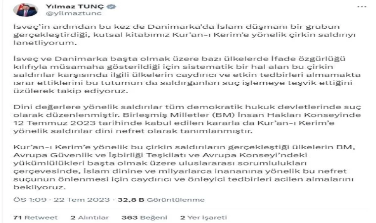 Bakan Tunç, Twitter hesabından yaptığı açıklamada, "İsveç’in ardından bu kez de Danimarka'da İslam düşmanı bir grubun gerçekleştirdiği, kutsal kitabımız Kur'an-ı Kerim'e yönelik çirkin saldırıyı lanetliyorum. İsveç ve Danimarka başta olmak üzere bazı ülkelerde İfade özgürlüğü kılıfıyla müsamaha gösterildiği için sistematik bir hal alan bu çirkin saldırılar karşısında ilgili ülkelerin caydırıcı ve etkin tedbirleri almamakta ısrar ettiklerini bu tutumun da saldırganları suç işlemeye teşvik ettiğini üzülerek takip ediyoruz. Dini değerlere yönelik saldırılar tüm demokratik hukuk devletlerinde suç olarak düzenlenmiştir. Birleşmiş Milletler (BM) İnsan Hakları Konseyinde 12 Temmuz 2023 tarihinde kabul edilen kararla da Kur’an-ı Kerim’e yönelik saldırılar dini nefret olarak tanımlanmıştır. Kur’an-ı Kerim’e yönelik bu çirkin saldırıların gerçekleştiği ülkelerin BM, Avrupa Güvenlik ve İşbirliği Teşkilatı ve Avrupa Konseyi’ndeki yükümlülükleri başta olmak üzere uluslararası sorumlulukları çerçevesinde, İslam dinine ve milyarlarca inananına yönelik bu nefret suçunun önlenmesi için caydırıcı ve önleyici tedbirleri acilen almalarını bekliyoruz" ifadelerini kullandı. (DHA)