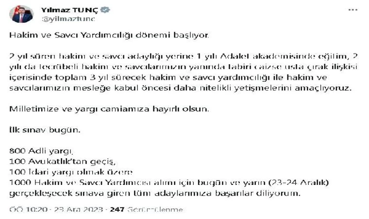 ANKARA, (DHA)- ADALET Bakanı Yılmaz Tunç, hakim ve savcı yardımcılığı döneminin başladığını belirterek, 1000 hakim ve savcı yardımcısı alımı için ilk sınavın bugün ve yarın gerçekleştirileceğini açıkladı.