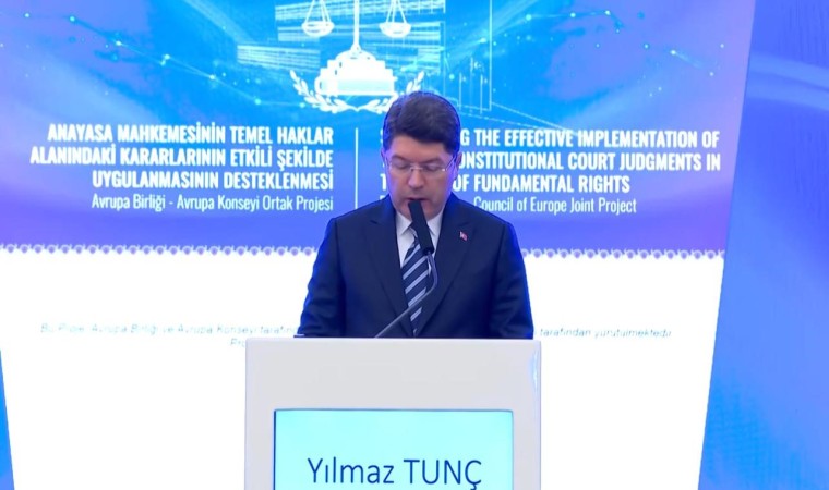 Tunç ayrıca adli yargılanmayla ilgili önemli oturumlar gerçekleştirdiklerini aktardı. Adaletin toplumsal barışın teminatı olduğundan bahseden Bakan Tunç, "Adalet, insan onurunu korumak için, insan haklarını korumak için vardır. Adaletin tecellisi için de hukuk devleti, şarttır hukuk devleti içinde kararsız ve bağımsız yargı olmazsa olmaz şarttır. Tabii tarafsız ve bağımsız yargının uyacağı en önemli kural da adil yargılanma hakkını en geniş anlamıyla tesis ederek kararlarını vermektir. Bu şekilde gerçekleşir ve bu şekilde insan onuru ve insan hakları korunur. Adil yargılanma hakkının temeli, doğal adalet ilkesine dayanır. Doğal adalet ilkesi, insanların doğuştan gelen haklarının korunması ve adil bir şekilde yargılanması üzerine kurulmuştur. Bu ilke tarafsızlık, dinlenilme hakkı ve taraflara eşit muamele gibi temel prensipleri içerir. Adil yargılanma hakkı ayrıca insan onurunu ve temel hakları korunması gerektiği fikrindendir. İnsanların onurlu bir şekilde yaşama hakkı muamele görmelerini gerektirir. Bu nedenle yargı süreçlerinde her bireyin saygı görmesi zamanlarının korunması esastır" diye konuşmasını noktaladı.