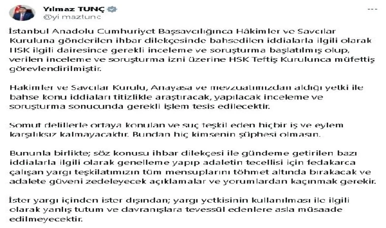 "İstanbul Anadolu Cumhuriyet Başsavcılığı'nca Hakimler ve Savcılar Kurulu'na gönderilen ihbar dilekçesinde bahsedilen iddialarla ilgili olarak HSK ilgili dairesince gerekli inceleme ve soruşturma başlatılmış olup, verilen inceleme ve soruşturma izni üzerine HSK Teftiş Kurulunca müfettiş görevlendirilmiştir. Hakimler ve Savcılar Kurulu, Anayasa ve mevzuatımızdan aldığı yetki ile bahse konu iddiaları titizlikle araştıracak, yapılacak inceleme ve soruşturma sonucunda gerekli işlem tesis edilecektir. Somut delillerle ortaya konulan ve suç teşkil eden hiçbir iş ve eylem karşılıksız kalmayacaktır. Bundan hiç kimsenin şüphesi olmasın. Bununla birlikte; söz konusu ihbar dilekçesi ile gündeme getirilen bazı iddialarla ilgili olarak genelleme yapıp adaletin tecellisi için fedakarca çalışan yargı teşkilatımızın tüm mensuplarını töhmet altında bırakacak ve adalete güveni zedeleyecek açıklamalar ve yorumlardan kaçınmak gerekir. İster yargı içinden ister dışından; yargı yetkisinin kullanılması ile ilgili olarak yanlış tutum ve davranışlara tevessül edenlere asla müsaade edilmeyecektir." (DHA)