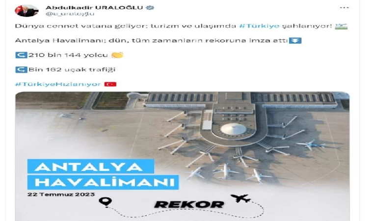 Enes GEYİK/ANKARA, (DHA)- ULAŞTIRMA ve Altyapı Bakanı Abdulkadir Uraloğlu, dün Antalya'ya Havalimanı'ndan 210 bin 144 yolcunun seyahat ettiğini ve tüm zamanların rekorunun kırıldığını duyurdu.