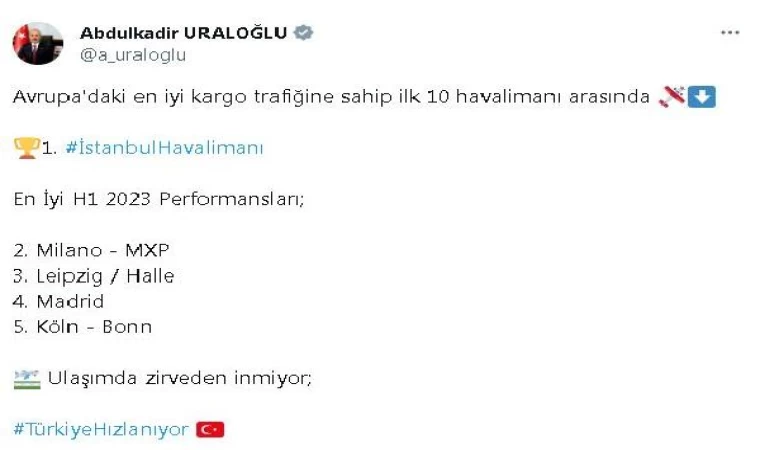 Bakan Uraloğlu, Twitter hesabından yaptığı açıklamada, "Avrupa'daki en iyi kargo trafiğine sahip ilk 10 havalimanı arasında İstanbul Havalimanı olarak birinci sıradayız. İstanbul Havalimanı ulaşımda zirveden inmiyor" ifadelerini kullandı. Uraloğlu, İstanbul Havalimanı'ndan sonra en yoğun kargo trafiğine sahip havalimanlarının; Milano-MXP Havalimanı, Leipzig-Halle Havalimanı, Madrid Havalimanı ve Köln-Bonn Havalimanı olduğunu açıkladı. (DHA)
