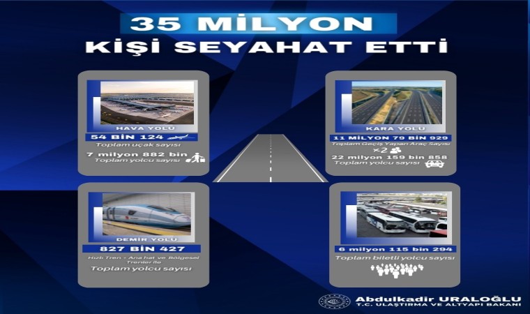 Ulaştırma ve Altyapı Bakanı Abdulkadir Uraloğlu, Kurban Bayramı boyunca kara, hava ve demiryolu ile seyahat edenlerin sayısının 35 milyonun üzerine çıktığını açıkladı.