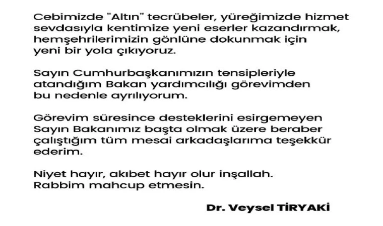 “Cebimizde ‘Altın’ tecrübeler, yüreğimizde hizmet sevdasıyla kentimize yeni eserler kazandırmak, hemşerilerimizin gönlüne dokunmak için yeni bir yola çıkıyoruz. Sayın Cumhurbaşkanımızın tensipleriyle atandığım bakan yardımcılığı görevimden bu nedenle ayrılıyorum. Görevim süresince desteklerini esirgemeyen Sayın Bakanımız başta olmak üzere beraber çalıştığım tüm mesai arkadaşlarıma teşekkür ederim. Niyet hayır, akıbet hayır olur inşallah. Rabbim mahcup etmesin."
