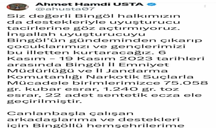 Bingöl Valisi Ahmet Hamdi Usta da 6-19 Kasım tarihleri arasından yapılan operasyonlarda 76 kilo 298 gram uyuşturucu madde ele geçirildiğini bildirdi. Bingöl Valisi Ahmet Hamdi Usta sosyal medya hesabından yaptığı açıklamada, ’’Siz değerli Bingöl halkımızın da destekleriyle uyuşturucu tacirlerine göz açtırmıyoruz. İnşallah uyuşturucuyu Bingöl’ün gündeminden çıkarıp çocuklarımızı ve gençlerimizi bu illetten kurtaracağız. 6-19 Kasım 2023 tarihleri arasında Bingöl İl Emniyet Müdürlüğü ve İl Jandarma Komutanlığı narkotik suçlarla mücadele birimlerimizce 75 kilo 58 gram kubar esrar, 1 kilo 240 gram toz esrar, 22 adet sentetik ecza ele geçirilmiştir. Canla, başla çalışan arkadaşlarıma ve destekleri için Bingöllü hemşehrilerime teşekkür ediyorum” dedi.