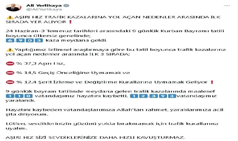 Bakan Yerlikaya, Twitter hesabından yaptığı açıklamada, trafik kazalarına yol açan nedenler arasında aşırı hızın ilk sırada yer aldığını belirterek, "24 Haziran- 3 Temmuz arasındaki 9 günlük Kurban Bayramı tatili boyunca ülkemiz genelinde 6 bin 903 kaza meydana geldi. Yaptığımız bilimsel araştırmaya göre bu tatil boyunca trafik kazalarına yol açan nedenler arasında ilk 3 sırada; yüzde 37,3 aşırı hız, yüzde 14,5 geçiş önceliğine uymamak ve yüzde 12,4 şerit izleme ve değiştirme kurallarına uymamak geliyor. 9 günlük bayram tatilinde meydana gelen trafik kazalarında maalesef 110 vatandaşımız hayatını kaybetti, 12 bin 393 vatandaşımız yaralandı" dedi. (DHA)