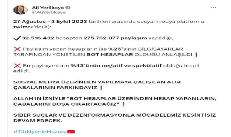 İçişleri Bakanı Ali Yerlikaya, sosyal medya hesabından yaptığı açıklamada, "27 Ağustos-3 Eylül 2023 tarihleri arasında sosyal medya platformu Twitter'da (X): 32 milyon 516 bin 432 hesaptan 275 milyon 762 bin 77 paylaşım yapıldığı, paylaşım yapan hesapların ise yüzde 26'sının bilgisayarlar tarafından yönetilen bot hesaplar olduğu anlaşıldı. Bu paylaşımların yüzde 43'ünün negatif ve spekülatif olduğu tespit edildi. Sosyal medya üzerinden yapılmaya çalışılan algı çabalarının farkındayız. Allah'ın izniyle, bot hesaplar üzerinden hesap yapanların çabalarını boşa çıkartacağız. Siber suçlar ve dezenformasyonla mücadelemiz kesintisiz devam edecek" ifadelerini kullandı. (DHA)
