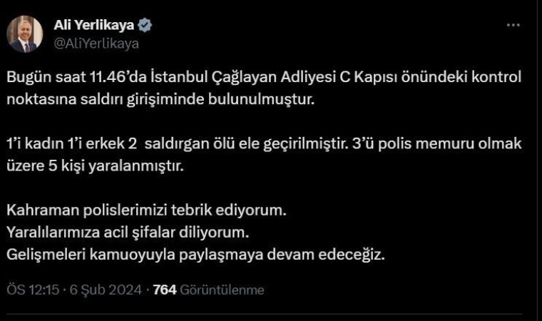 Bakan Yerlikaya’nın sosyal medya hesabından yaptığı açıklamada, “Bugün saat 11.46’da İstanbul Çağlayan Adliyesi C Kapısı önündeki kontrol noktasına saldırı girişiminde bulunulmuştur. 1’i kadın 1’i erkek 2 saldırgan ölü ele geçirilmiştir. 3’ü polis memuru olmak üzere 5 kişi yaralanmıştır. Kahraman polislerimizi tebrik ediyorum. Yaralılarımıza acil şifalar diliyorum. Gelişmeleri kamuoyuyla paylaşmaya devam edeceğiz” ifadeleri yer aldı.