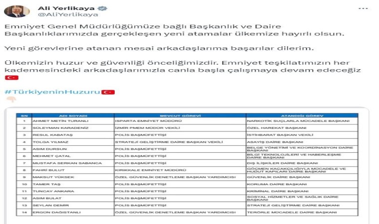 İçişleri Bakanı Ali Yerlikaya, Emniyet Genel Müdürlüğüne bağlı başkanlık ve daire başkanlıklarına yeni atamaları sosyal medya hesabından duyurdu.