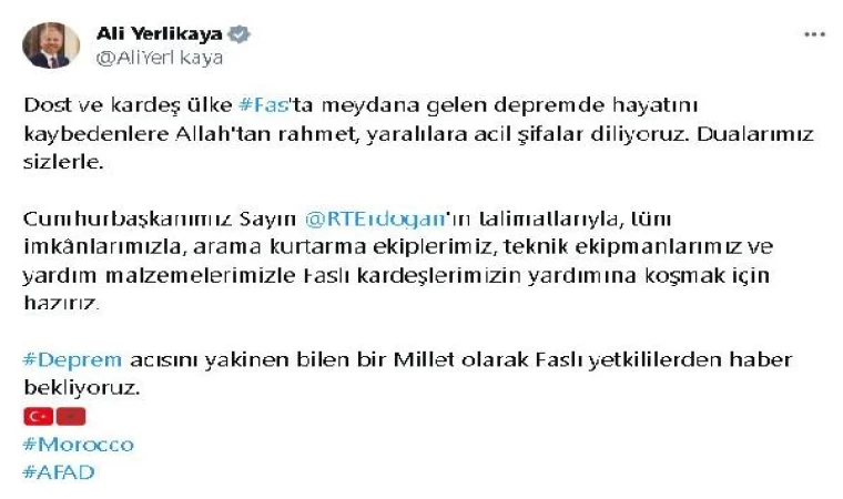 Bakan Yerlikaya, sosyal medya hesabından yaptığı açıklamada, "Dost ve kardeş ülke Fas'ta meydana gelen depremde hayatını kaybedenlere Allah'tan rahmet, yaralılara acil şifalar diliyoruz. Dualarımız sizlerle. Cumhurbaşkanımız Sayın Recep Tayyip Erdoğan'ın talimatlarıyla, tüm imkanlarımızla, arama kurtarma ekiplerimiz, teknik ekipmanlarımız ve yardım malzemelerimizle Faslı kardeşlerimizin yardımına koşmak için hazırız. Deprem acısını yakinen bilen bir millet olarak Faslı yetkililerden haber bekliyoruz" ifadelerini kullandı. (DHA)