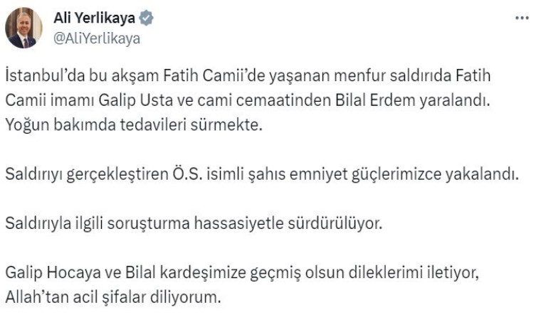 İstanbul’da Fatih Camii İmamı Galip Usta’ya yönelik saldırıya ilişkin sosyal medya hesabından açıklamada bulunan İçişleri Bakanı Ali Yerlikaya, “İstanbul’da bu akşam Fatih Camii’nde yaşanan menfur saldırıda Fatih Camii İmamı Galip Usta ve cami cemaatinden Bilal Erdem yaralandı. Yoğun bakımda tedavileri sürmekte. Saldırıyı gerçekleştiren Ö.S. isimli şahıs emniyet güçlerimizce yakalandı. Saldırıyla ilgili soruşturma hassasiyetle sürdürülüyor. Galip hocaya ve Bilal kardeşimize geçmiş olsun dileklerimi iletiyor, Allah’tan acil şifalar diliyorum” ifadelerini kullandı.
