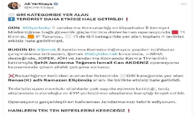 Bakan Yerlikaya, sosyal medya hesabından yaptığı açıklamada, dün Diyarbakır İl Jandarma Komutanlığı ve Diyarbakır İl Emniyet Müdürlüğü'ne bağlı güvenlik güçlerince düzenlenen operasyonda, 1'i kırmızı,1'i turuncu, 1'i de gri kategoride yer alan toplam 4 teröristin etkisiz hale getirildiğini hatırlatarak, "Bugün de Şırnak İl Jandarma Komutanlığımızca yapılan istihbarat çalışmalarına istinaden, Şırnak Güçlükonak kırsalında, jandarma SİHA desteğinde, Jandarma Komando Operasyon Tabur Komutanlığı (JOPER), jandarma özel harekat (JÖH) ve jandarma komando karma timlerinin katılımıyla 'Şehit Jandarma Teğmen İsmail Can Akdeniz' operasyonu kapsamında çıkan silahlı çatışma sonucu; bakanlığımız terörden arananlar listesinde gri kategoride yer alan 'Renas' kod adlı Ramazan Eliçümüş silahı ile birlikte etkisiz hale getirildi. Teröristin uzun namlulu silahlarla çok sayıda eyleme katıldığı, taciz atışlarında bulunduğu ve el yapımı patlayıcı yerleştirme olaylarına karıştığı tespit edildi" dedi.