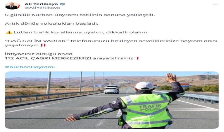 KURBAN BAYRAMI’NIN ARDINDAN DÖNÜŞ YOLCULUKLARINA İLİŞKİN SOSYAL MEDYADA PAYLAŞIMDA BULUNAN İÇİŞLERİ BAKANI ALİ YERLİKAYA, “LÜTFEN TRAFİK KURALLARINA UYALIM, DİKKATLİ OLALIM” İFADELERİNİ KULLANDI.
