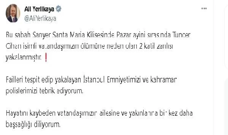 İçişleri Bakanı Ali Yerlikaya, Sarıyer Santa Maria Kilisesi'nde yaşanan olaya ilişkin sosyal medya hesabından yaptığı açıklamada, "Bu sabah Sarıyer Santa Maria Kilisesinde Pazar ayini sırasında Tuncer Cihan isimli vatandaşımızın ölümüne neden olan 2 katil zanlısı yakalanmıştır. Failleri tespit edip yakalayan İstanbul Emniyetimizi ve kahraman polislerimizi tebrik ediyorum. Hayatını kaybeden vatandaşımızın ailesine ve yakınlarına bir kez daha başsağlığı diliyorum" dedi. (DHA)