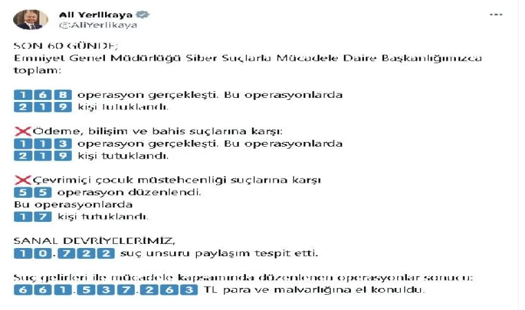 Bakan Yerlikaya, Emniyet Genel Müdürlüğü Siber Suçlarla Daire Başkanlığı'nca son 2 ay içerisinde yapılan çalışmalara ilişkin, sosyal medya hesabından açıklama yaptı. Bakan Yerlikaya, "Son 60 günde; Emniyet Genel Müdürlüğü Siber Suçlarla Mücadele Daire Başkanlığı'mızca toplam 168 operasyon gerçekleşti. Bu operasyonlarda 219 kişi tutuklandı. 'Ödeme, bilişim ve bahis' suçlarına karşı 113 operasyon gerçekleşti. Bu operasyonlarda 219 kişi tutuklandı. 'Çevrim içi çocuk müstehcenliği' suçlarına karşı 55 operasyon düzenlendi. Bu operasyonlarda 17 kişi tutuklandı. Sanal devriyelerimiz, 10 bin 722 suç unsuru paylaşım tespit etti. Suç gelirleri ile mücadele kapsamında düzenlenen operasyonlar sonucu 661 milyon 537 bin 263 TL para ve malvarlığına el konuldu" açıklamasında bulundu. (DHA)