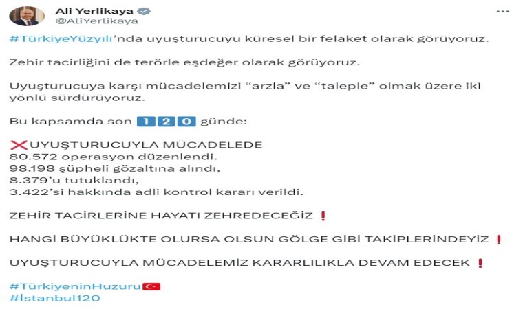 İçişleri Bakanı Ali Yerlikaya sosyal medya hesabından “Son 120 günde 80 bin 572 uyuşturucuyla mücadelede operasyonu düzenlendi” açıklamasında bulundu.