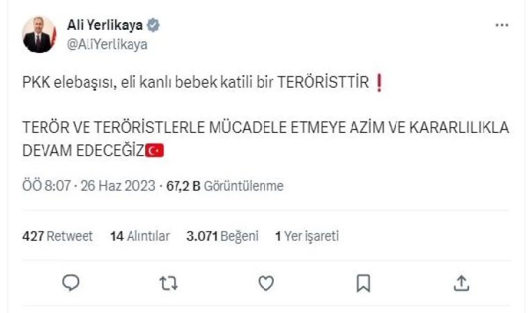 İçişleri Bakanı Ali Yerlikaya, terörle mücadelede kararlılıkla devam edeceklerini belirterek, "PKK elebaşısı, eli kanlı bebek katili bir teröristtir. Terör ve teröristlerle mücadele etmeye azim ve kararlılıkla devam edeceğiz" dedi.