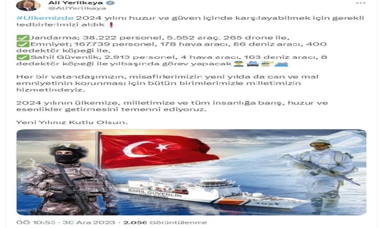 ANKARA, (DHA)- İÇİŞLERİ Bakanı Ali Yerlikaya, ”Ülkemizde 2024 yılını huzur ve güven içinde karşılayabilmek için gerekli tedbirlerimizi aldık” dedi.