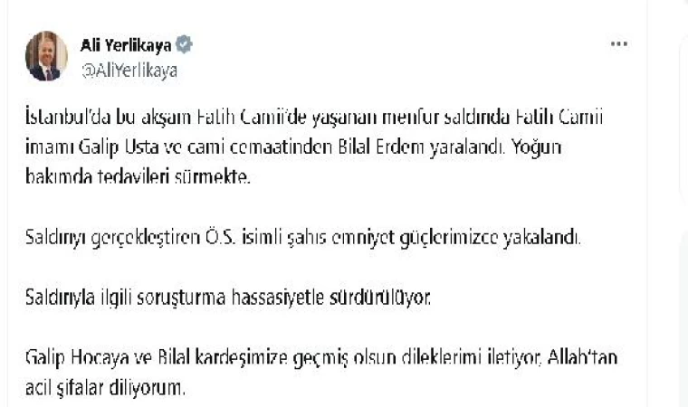 İçişleri Bakanı Ali Yerlikaya, sosyal medya hesabından yaptığı açıklamada, "İstanbul'da bu akşam Fatih Camii'de yaşanan menfur saldırıda Fatih Camii imamı Galip Usta ve cami cemaatinden Bilal Erdem yaralandı. Yoğun bakımda tedavileri sürmekte. Saldırıyı gerçekleştiren Ö.S. isimli şahıs emniyet güçlerimizce yakalandı. Saldırıyla ilgili soruşturma hassasiyetle sürdürülüyor. Galip Hocaya ve Bilal kardeşimize geçmiş olsun dileklerimi iletiyor, Allah'tan acil şifalar diliyorum" dedi. (DHA)