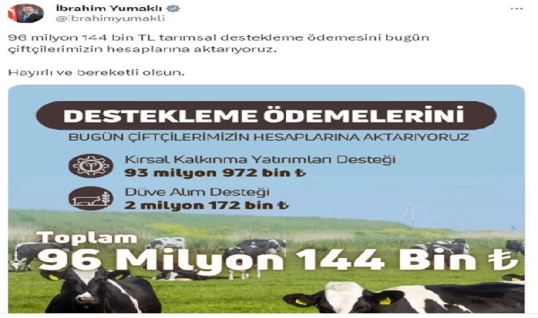 Bakan Yumaklı, Twitter'daki hesabından yaptığı açıklamada, 93 milyon 972 bin TL kırsal kalkınma yatırımları desteği, 2 milyon 172 bin TL düve alım desteği olmak üzere toplam 96 milyon 144 bin TL tarımsal destekleme ödemesinin bugün çiftçilerin hesabına aktırılacağını belirtti. Yumaklı, "Hayırlı ve bereketli olsun" dedi. (DHA)