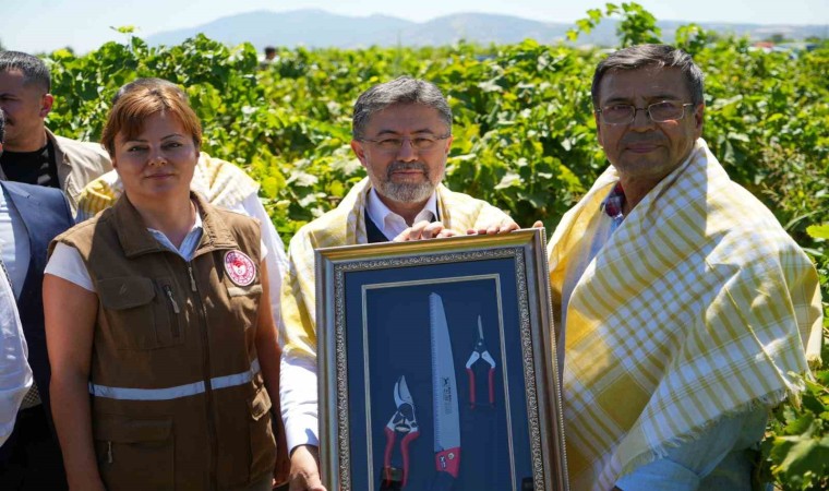 Bakan Yumaklı’ya çiftçiler tarafından bağ araç ve gereçlerin bulunduğu tablo hediye edildi.