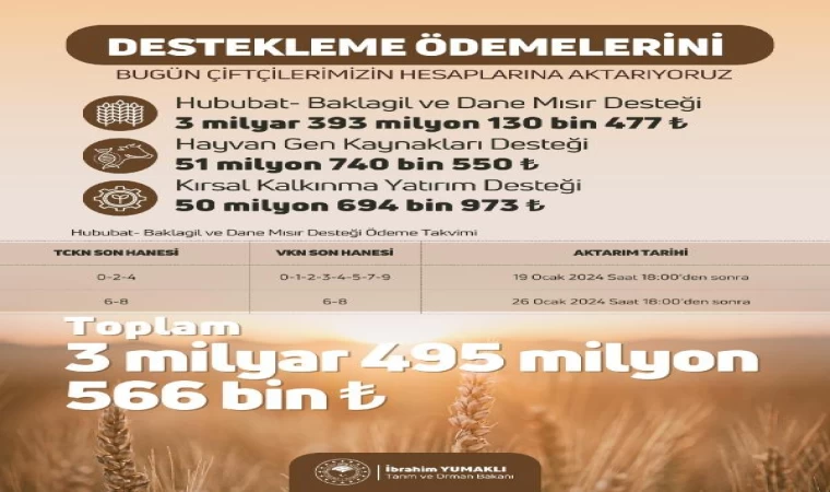 Tarım ve Orman Bakanı İbrahim Yumaklı, sosyal medya hesabından yaptığı açıklamada, "3 milyar 495 milyon 566 bin TL tarımsal destekleme ödemesi bugün çiftçilerimizin hesaplarına aktarıldı. Hayırlı ve bereketli olsun" dedi. (DHA)