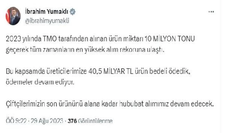 Şaduman TÜRKAY/ANKARA, (DHA)- TARIM ve Orman Bakanı İbrahim Yumaklı, 2023 yılında Toprak Mahsulleri Ofisi (TMO) tarafından alınan ürün miktarının 10 milyon tonu geçerek tüm zamanların en yüksek alım rekoruna ulaştığını duyurdu.