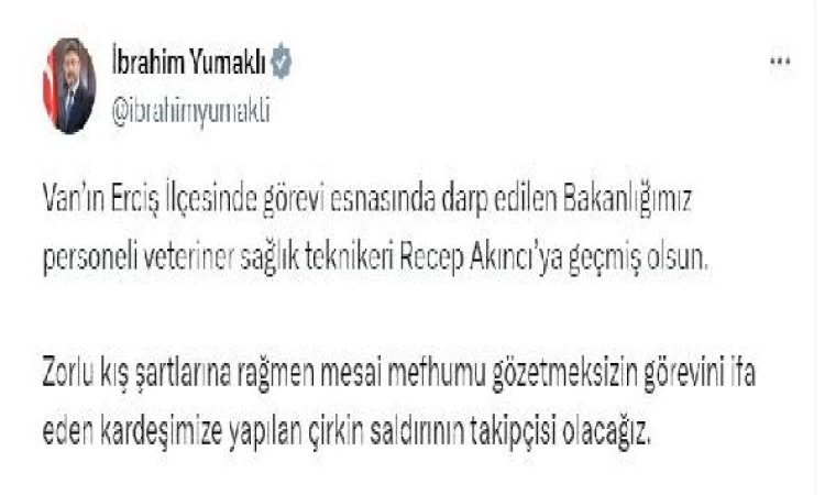 ANKARA, (DHA)- TARIM ve Orman Bakanı İbrahim Yumaklı, Van'ın Erciş ilçesinde hayvan sayımına giden veteriner sağlık teknikerinin darbedilmesine ilişkin, "Kardeşimize yapılan çirkin saldırının takipçisi olacağız" dedi.