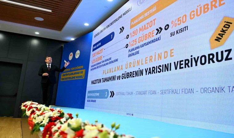 “Bitkisel üretim destekleme modeli; temel destek, planlama desteği ve üretim geliştirme desteği olarak 3 ana başlığa indirilmiş durumda. Temel destek ne? Planlamaya dahil olan ürünlerin dışındaki ürünlere ve planlamaya dahil olup da belirlenen havzalarda üretilen ürünlere başka her hangi bir kıstas aranmaksızın o ürünler için kullanılan mazotun yarısının, gübrenin ise yüzde 25’ini vermek üzere tasarlandı. Türkiye’de üretim yapan bütün üreticiler temel desteği alacak. Sadece planlama grubundaki ürünler için bir farklılık var. Onların belirlenen havzalarda üretilmesi istiyoruz.”