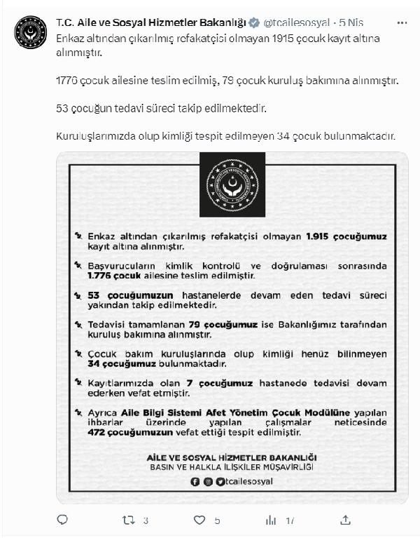 Deprem sırasında enkaz altına alınmayan 1915 bireysel ve grup refakatinde bulunan çocukların haritalı ve kimlikli olarak kayıt altına alındığı; kayıtlı 1915 çocuklardan 98 yaş ve üzerindeki 8 çocuktan değerlendirme raporu istendiği, tespit edilen kayıtlı 1915 çocuk taşınan hayırsever vatandaşlardan 1 kişinin hayırseverlik başvurusunda bulunmuş olması ve buradaki.daha şimşek çocuklarının aileden ve dernek başkanlarından Refakatçiler gönderildiği belirtilirken