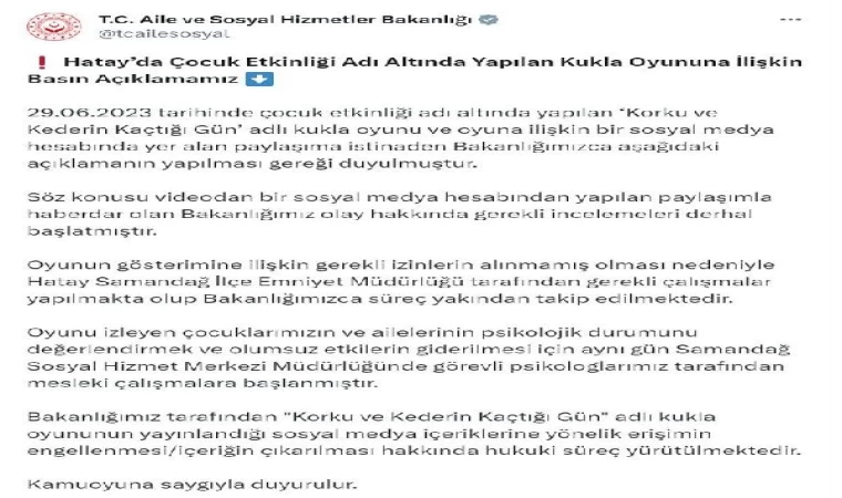AİLE ve Sosyal Hizmetler Bakanlığı, Hatay'da sergilenen ve depremi anlatan kukla oyunuyla ilgili soruşturma başlattığını açıkladı. Bakanlık Twitter hesabından yapılan açıklamada, 29 Haziran 2023 tarihinde gerçekleştirilen 'Korku ve Kederin Kaçtığı Gün' adlı kukla oyunu ve bu oyunla ilgili bir sosyal medya paylaşımının dikkat çekmesi üzerine açıklama yapma gerekliliği doğduğu ifade edildi. Açıklamada, Bakanlık tarafından olayın derhal incelenmeye başlandığı, oyunun gösterimi için gerekli izinlerin alınmamış olması nedeniyle Hatay Samandağ İlçe Emniyet Müdürlüğü tarafından gerekli çalışmaların yürütüldüğü vurgulandı.