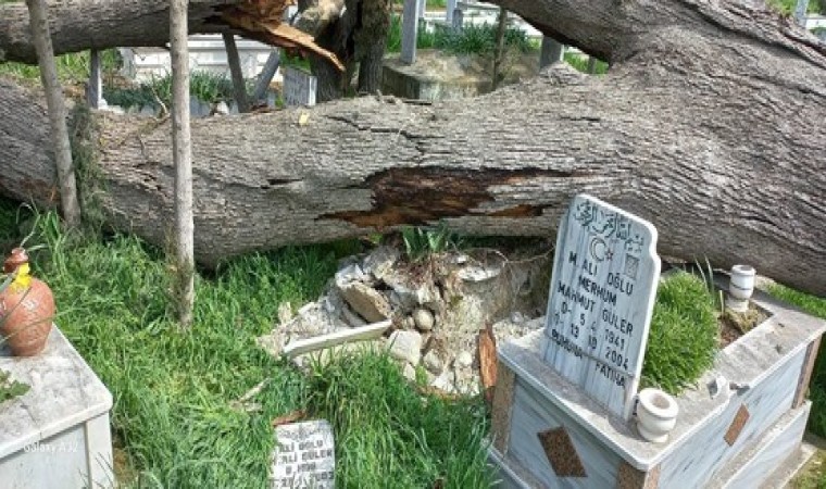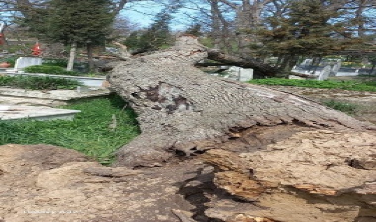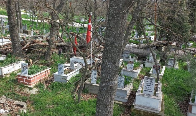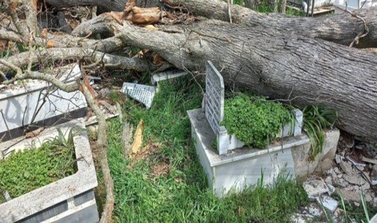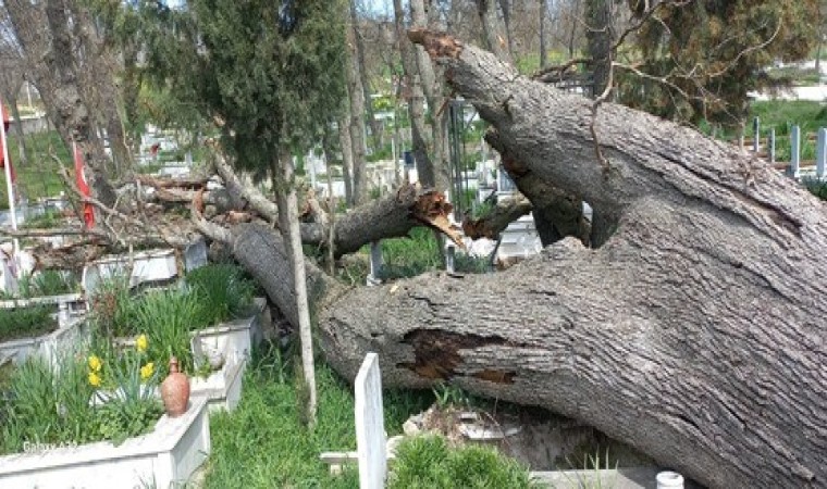 DENİZLİ (İHA) – Denizli’nin Buldan ilçesi Kadıköy Mahalle Mezarlığında bulunan asırlık meşe ağaçlarından bazıları uzun süredir bakımsız kalması nedeniyle mezarların üstüne devrildi.