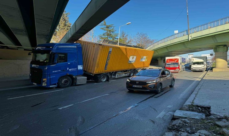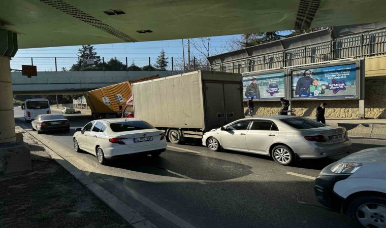 Bakırköy’de yaklaşık 4 ay önce Togg yüklü tırın takıldığı üst geçitte bir başka tır, yüksekliği hesaplayamayarak kaza yaptı. Alt geçide çarpan tırın dorsesi yan dönerken, arkadan gelen kamyonet sürücüsü ani fren yapınca otomobil de kamyonete çarptı. Kazada üç araçta hasar meydana gelirken, sürücüler kazayı yara almadan atlattı.