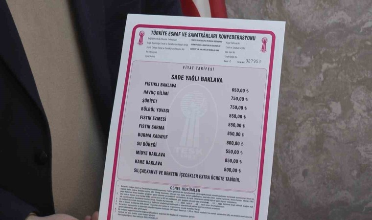Zamların esnafı ve vatandaşı en az şekilde etkiyecek şekilde yaptıklarını söyleyen Abdulkadir Katmerci, “2023 yılının 6. ayında vermiş olduğumuz güncel fiyat listesinin üzerine 2024 yılında da enflasyon oranının altında bir zam vermiş olduk. Bu kafeterya, lokanta, baklava sektörünün tamamını kapsayacak bir şekilde esnafımızın da faaliyetlerine devam edebilmesi için iş yerlerinin ayakta kalabilmesi için bu zammı vermemiz gerekiyordu. Yüzde 40 fiyat artışı oldu. 1 kilogram sade yağlı baklava satış fiyatımız 650 TL oldu. Çeşitlerine girdiğimizde havuç dilimi 750 TL, bülbülyuvası 850 TL, kare baklava ise 800 TL olarak satışla devam edecek. Bu 2024 yılının 6. ayına kadar olağanüstü bir durumu olmazsa bizim odamıza bağlı tüm esnaflarımızı kapsayan fiyat tarifemiz bu şekildedir" diye konuştu.