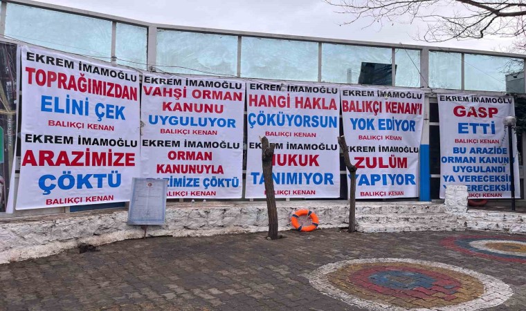 Dükkanının çevresine "Ekrem İmamoğlu toprağımızdan elini çek", "Ekrem İmamoğlu zulüm yapıyor" yazılı pankartlar asan Kenan Balcı, yetkililerden yardım istedi.