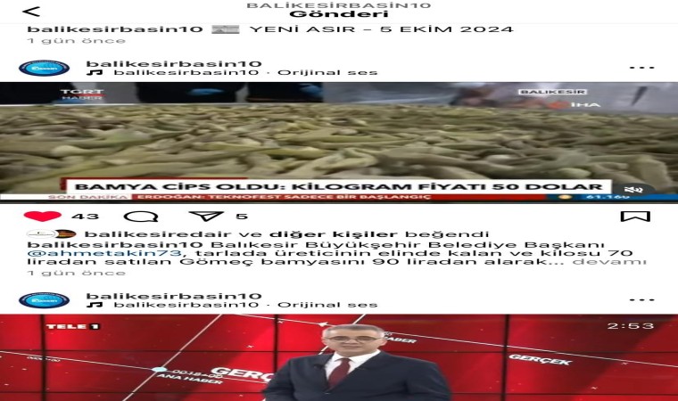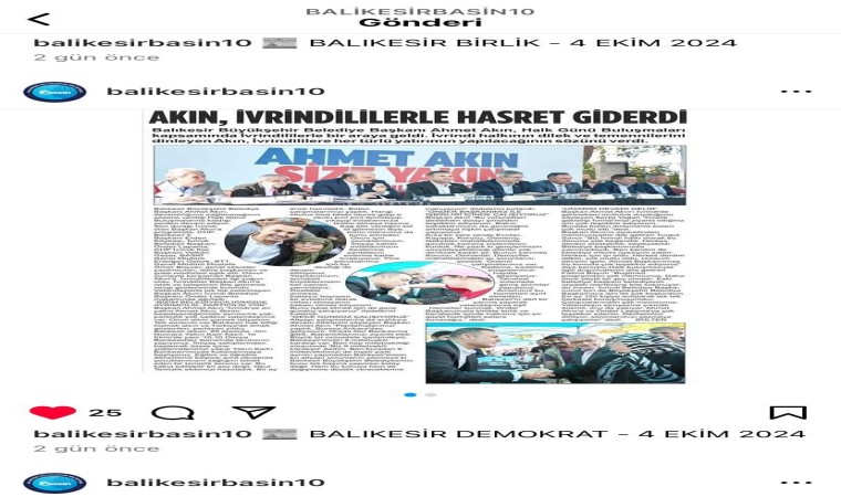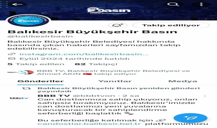 Balıkesir Büyükşehir Belediyesi Basın Yayın ve Halkla İlişkiler Dairesi Başkanlığı; Facebook, Instagram ve X sosyal medya platformlarında “Balıkesir Büyükşehir Basın” adıyla bir hesap açtı. Balıkesir Büyükşehir Belediyesi ile Başkan Ahmet Akın’ın; ulusal, bölgesel ve yerel basın yayın kuruluşlarında çıkan yazılı ve videolu haberlerinin paylaşıldığı sayfa, Balıkesirlilerin takibiyle her geçen gün daha da güçlü bir hale gelecek. Yalnızca Balıkesir’de yaşayan vatandaşların değil, Balıkesirli olup da farklı şehirlerde yaşayan vatandaşların da ilgisini çekecek sosyal medya hesapları; Balıkesir Büyükşehir Belediyesi ve Başkan Ahmet Akın’ın gerçekleştirmiş olduğu hizmet ve faaliyetlerden vatandaşların haberdar olmasını ve kolay erişim imkanı sağlayacak.