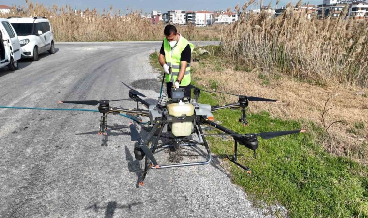 Altınkum Dalyan Kent Bölgesinde çalışmalarını gerçekleştiren Büyükşehir Belediyesi Çevre Koruma Teknikeri Kerem Şehitoğlu “Ekiplerimiz; Edremit-Ayvalık Körfez Bölgemizde ve Güney Marmara Bölgemizde sürekli yaptıkları saha kontrollerinde sıcaklıkların mevsim normallerinde seyretmesinden dolayı ekiplerimiz sahada yaptıkları kontrollerde larva üremelerinin başladığını tespit etmişlerdir. Bu sebeple biz de Balıkesir Büyükşehir Belediyesi olarak ilçe belediyeleriyle koordineli bir şekilde yürüttüğümüz haşere mücadele faaliyetleri kapsamında; ulaşılamayan bölgeler, sazlık alanlar gibi kısımlarda araçların giremediği, insanların ulaşamadığı bölgelerde dron ile ilaçlama yapıyoruz. Atık su arıtma tesisinin olduğu alanda çok fazla yer altı kaynaklarından kaynaklı sazlık alan mevcut. Bu kısımda arkada ekiplerimiz dron ile ilaçlama yapmakta. Bu kısımda da ulaşılamayan alanlara blower ile uygulama yapmaktayız. Büyükşehir Belediye Başkanımız Sayın Yücel Yılmaz Başkanımızın talimatlarıyla haşere mücadele çalışmalarını yılın 12 ayında sürdürmekteyiz. Başkanımız, haşereyle mücadeleye çok önem vermekte. Sürekli ekiplerimiz sahada kontrollerine devam etmektedir. Ve ilk tespit esnasında mücadeleyi başlattık. Şu anda larva mücadele çalışmalarımız Körfez Bölgesi’nde ve Güney Marmara Bölgemizde başlamıştır” dedi.