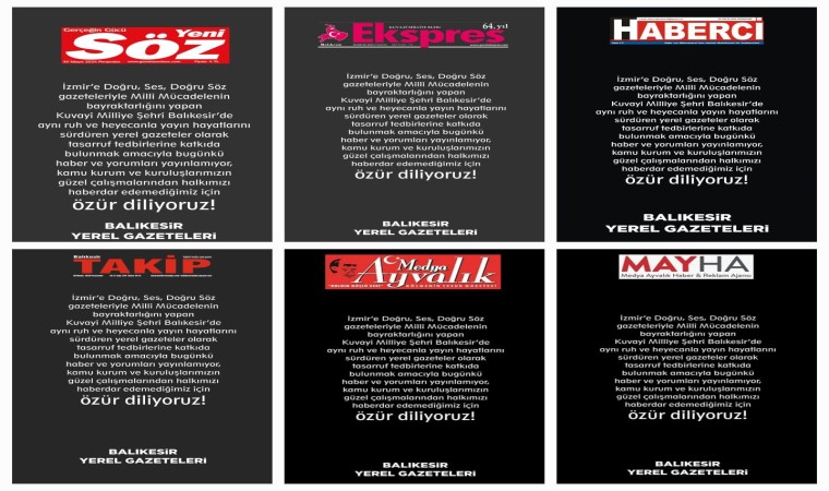 Balıkesir’de yayın yapan gazeteler ve medya kuruluşları Cumhurbaşkanlığı tasarruf genelgesinin yayınlanması sonucu Balıkesir Valiliği ve bağlı kurumlar basın kuruluşlarına gönderdiği yazı ile aboneliklerini iptal etmesi sonucu bir araya gelen medya temsilcileri bugünkü 1. sayfalarını siyah baskı ile karattılar. Balıkesir’de yayın yapan gazetelerin ilk sayfasında, "İzmir’e Doğru, Ses, Doğru Söz gazeteleriyle Milli Mücadelenin bayraktarlığını yapan Kuvayi Milliye Şehri Balıkesir’de aynı ruh ve heyecanla yayın hayatlarını sürdüren yerel gazeteler olarak, tasarruf tedbirlerine katkıda bulunmak amacıyla bugünkü haber ve yorumları yayınlamıyor, kamu kurum ve kuruluşlarımızın güzel çalışmalarından halkımızı haberdar edemediğimiz için özür diliyoruz. Balıkesir Yerel Gazeteleri" notu yer aldı.