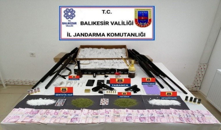 Balıkesir’de jandarma ekipleri il genelinde son 1 haftada yaptıkları kaçakçılık ve organize suç olaylarına yönelik operasyon düzenledi. Operasyonlarda 20 şüpheli şahıs gözaltına alınırken, çok miktarda uyuşturucu madde, 11 ateşli silah ve suçtan elde edildiği düşünülen 19 bin TL para ele geçirildi.