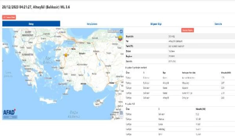 Afet ve Acil Yönetim Başkanlığı (AFAD) verilerine göre saat 07.21'de merkez üssü Balıkesir'in Altıeylül ilçesinde Richter ölçeğine göre, 3.6 büyüklüğünde deprem meydana geldi. Zeminden 6.92 kilometre derinlikte meydana gelen deprem, Balıkesir merkezin yanı sıra çevre ilçelerde de hissedildi. Sarsıntı paniğe yol açarken, ilk belirlemelere göre herhangi bir olumsuzluk yaşanmadı. AFAD ve ilgili kurum görevlileri saha çalışması başlattı. (DHA)