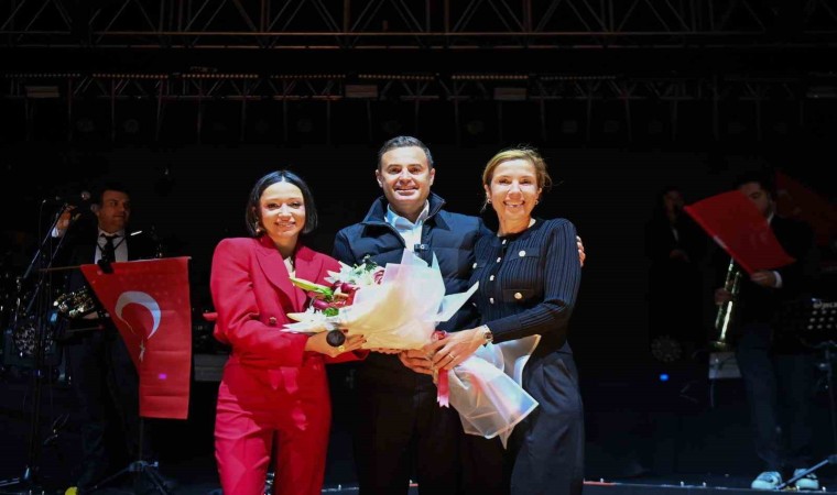 Sahneye eşi Arbil Akın ile birlikte çıkan Balıkesir Büyükşehir Belediye Başkanı Ahmet Akın, ünlü sanatçı Zeynep Bastık’a çiçek takdim ederek Balıkesir’in Cumhuriyet coşkusuna eşlik ettiği için ünlü sanatçıya teşekkür etti.