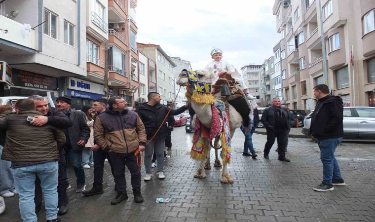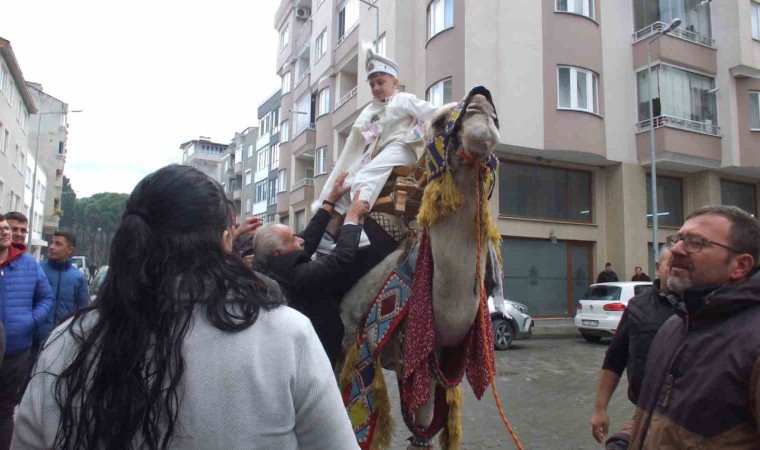 Burhaniye’de deve kültürünü seven 45 yaşındaki Ersan Erdoğan, oğlu Caner Erdoğan’ı sünnet töreninde otomobil yerine deve ile gezdirdi. Koca Cami önünde deveye bindirilen Caner Erdoğan, bayraklar eşliğinde tekbirlerle evinin önüne getirildi. Evin önünde din görevlisi Ali Ulvi Çakır dua yaptı. Devecilik kültürünü yaşatmak istediklerini anlatan baba Ersan Erdoğan, oğlunun da deve ile gezmek istediğini söyledi. Baba Ersan Erdoğan, “ Bizde devecilik kültürü vardır. Sünnet çocuğumuzda deve istediği için böyle yaptık. Bizde de deveyi sevdiğimiz için dualarla deveye bindirdik. Evimizin önüne getirdik. Her şey çok güzel oldu. Katılan herkese teşekkür ediyoruz” dedi.